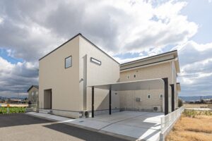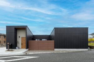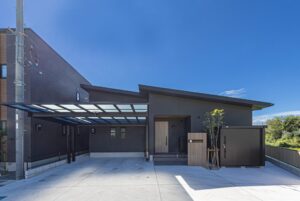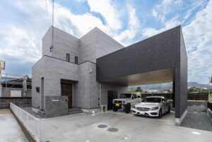 外壁はダークグレーな色合いフラットな質感がモダンでかっこいいデザイン。下から上に勾配がある土地なので、車を降りてすぐの場所に玄関がある間取り。道路側の外壁にあえて凹凸を造ることで立体的なデザインと施工面積を減らせるメリットを両立できる。お庭ではバーベキューや子ども用のプールも出すことができる広さ。